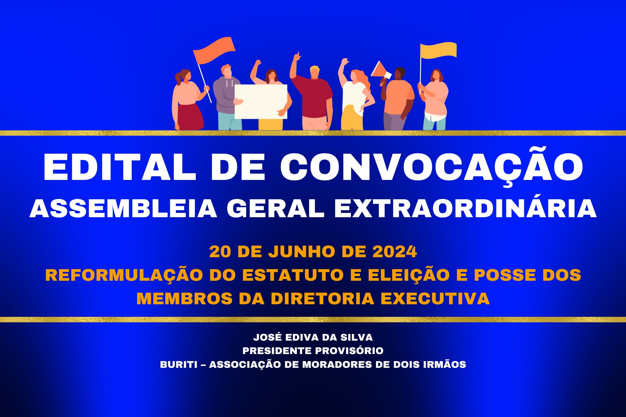 Dois Irmãos do Buriti-MS, 21 de maio de 2024 — O presidente provisório da Buriti - Associação dos Moradores de Dois Irmãos, José Ediva da Silva, convoca todos os associados para participarem de uma Assembleia Geral Extraordinária. A reunião será realizada no dia 20 de junho de 2024, na Câmara Municipal de Dois Irmãos do Buriti, localizada na Rua Salustiano Ferreira Ribeiro, nº 257. A primeira convocação está marcada para às 19h e a segunda convocação para às 19h30min. A Assembleia tem como objetivos principais a reformulação do estatuto da Associação e a eleição e posse dos novos membros da Diretoria Executiva, Conselho Consultivo e Conselho Fiscal. Esta é uma oportunidade crucial para que todos os associados participem ativamente na definição do futuro da Associação e na escolha dos novos líderes que irão guiar as atividades e projetos voltados para o benefício da comunidade. Informações do Presidente Provisório: José Ediva da Silva enfatiza a importância da presença de todos os associados para garantir uma gestão democrática e representativa. "A participação de cada associado é essencial para que possamos tomar decisões importantes e eleger novos membros que tragam inovação e comprometimento com os objetivos da nossa Associação", afirma José Ediva. Detalhes da Assembleia Geral Extraordinária: Pontos de Pauta: Esta Assembleia é um momento decisivo para a Buriti - Associação dos Moradores de Dois Irmãos. A participação ativa de todos os associados é vital para assegurar que as mudanças propostas e as eleições sejam conduzidas de forma transparente e inclusiva, refletindo os interesses de toda a comunidade. Por ser expressão da verdade, firmo o presente. José Ediva da Silva